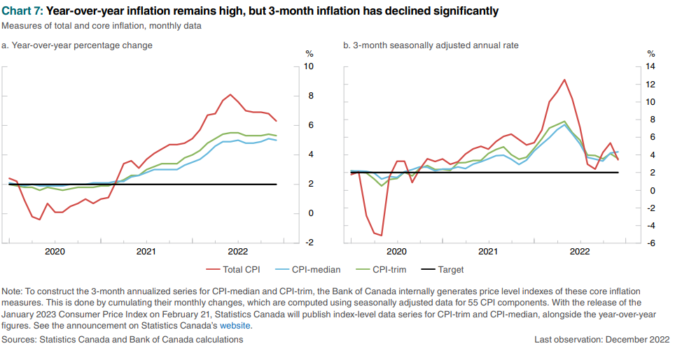 The BoC says, ‘Inflation is projected to come down significantly this year. Lower energy prices, improvements in global supply conditions, and the effects of higher interest rates on demand are expected to bring CPI inflation down to around 3% in the middle of this year and back to the 2% target in 2024.’ (the emphasis is mine.)