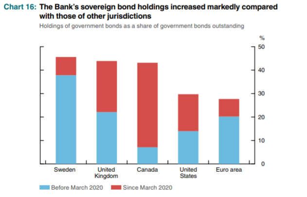 The Bank’s total ownership of GoC bonds outstanding has increased to about 42 percent. Since March 2020, the Bank has purchased more than 35 percent of total sovereign bonds outstanding, a higher percentage than other central banks (see chart below). Considering the size of Canada’s bond market and its economy, this means that the Bank has provided an extraordinary amount of stimulus. The Bank must continue to taper its purchases to ensure sufficient tradeable GoCs are available for longer-term institutional investors–such as insurance companies and pension funds–that must hold triple-A debt to offset their long-term liabilities.