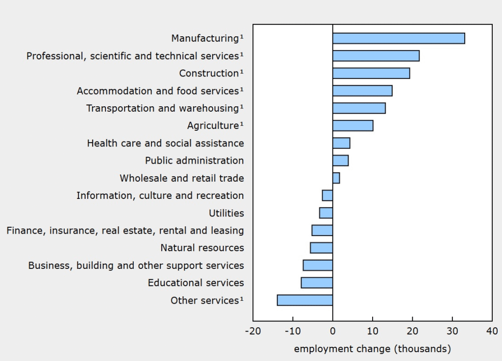 Employment also increased in accommodation and food services (+15,000; +1.3%), transportation and warehousing (+13,000; +1.2%) and agriculture (+10,000; +4.4%) in January. At the same time, there were fewer people employed in ‘other services’ (which includes personal and repair services) (-14,000; -1.8%).
