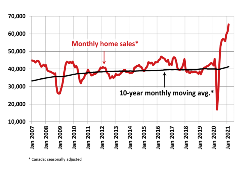The actual (not seasonally adjusted) national average home price was a record $716,828 in March 2021, up 31.6% from the same month last year. That said, it is important note that the biggest increase in new supply and thus sales in March was in Greater Vancouver, which raised that market’s share of national activity to its highest level in almost four years.