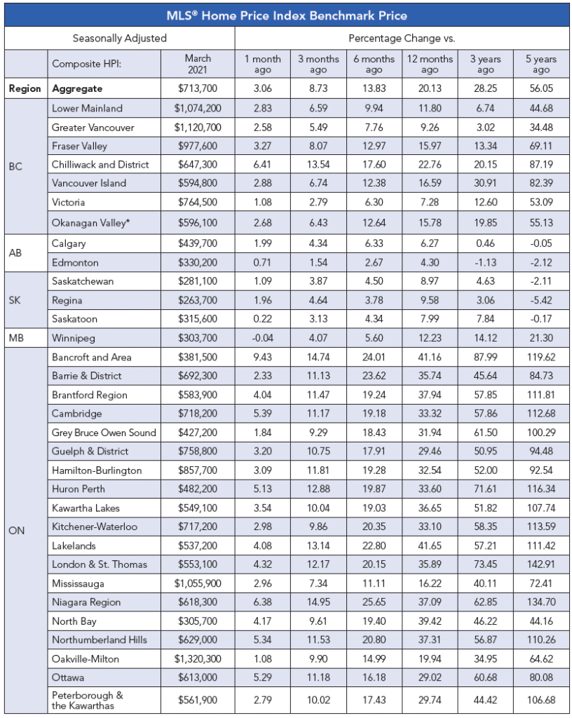 The Aggregate Composite MLS® Home Price Index (MLS® HPI) climbed by 3.1% m-o-m in March 2021 – similar to but slightly less than the record gain in February.