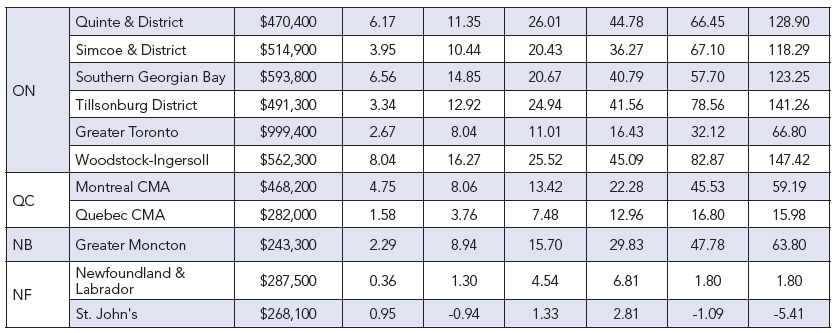 The largest y-o-y gains continue to be posted across Ontario, followed by markets in B.C., Quebec and New Brunswick, then by single-digit gains in the Prairie provinces and Newfoundland and Labrador.