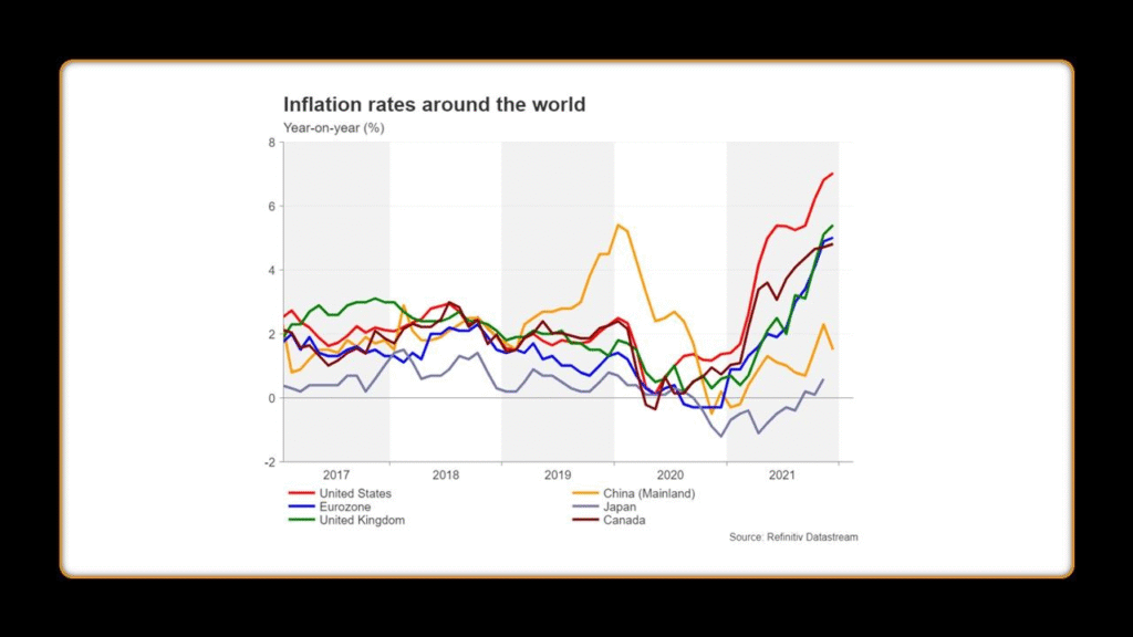 The Bank of Canada is very concerned about maintaining its hard-won inflation-fighting credibility. Remember that while Canadian inflation is at a 30-year high–as it is in the rest of the world–at 4.8%, Canadian inflation pales compared to the 7.0% rate in the U.S. and 6.8% rate in the U.K. (see chart below). It is also below the pace of the Euro area. The Bank stated that ‘CPI inflation remains well above the target range and core measures of inflation have edged up since October. Persistent supply constraints are feeding through to a broader range of goods prices and, combined with higher food and energy prices, are expected to keep CPI inflation close to 5% in the first half of 2022. As supply shortages diminish, inflation is expected to decline reasonably quickly to about 3% by the end of this year and gradually ease towards the target over the projection period. Near-term inflation expectations have moved up, but longer-run expectations remain anchored on the 2% target. The Bank will use its monetary policy tools to ensure that higher near-term inflation expectations do not become embedded in ongoing inflation.’