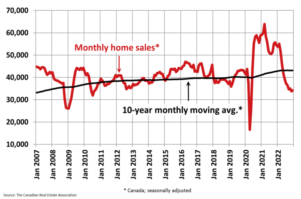 Home sales recorded over Canadian MLS® Systems increased 1.3% between November and December 2022. Ottawa and Edmonton led gains. Nevertheless, the actual number of transactions last month was 39.1% below year-ago levels and dramatically below the 10-year monthly moving average for December (see chart below).