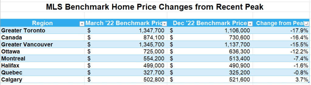 The table below shows the decline in MLS-HPI benchmark home prices in Canada and selected cities since prices peaked in March when the Bank of Canada began hiking interest rates. More details follow in the second table below. The most significant price dips are in the GTA and the GVA, where the price gains were spectacular during the Covid-shutdown.