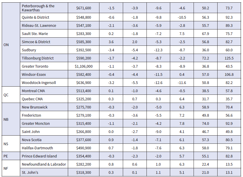 The Aggregate Composite MLS® HPI, which adjusts for the type of property sold, now sits about 13% below its peak level. Looking across the country, prices are down more than they are nationally in Ontario and parts of B.C. and down by less elsewhere. While prices have softened to some degree almost everywhere, Calgary, Regina, Saskatoon, and St. John’s stand out as markets where home prices are barely off their peaks at all.