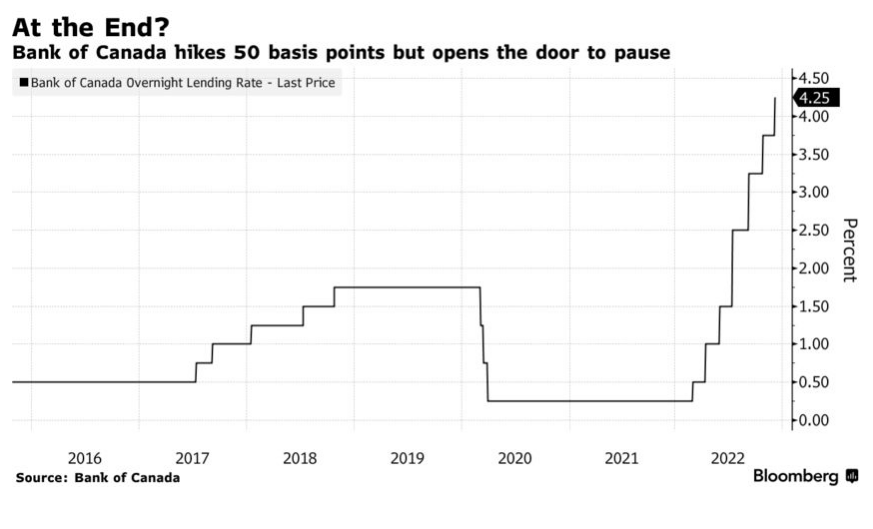 The Governing Council of the Bank of Canada raised its target for the overnight policy rate by 50 basis points today to 4.25% and signalled that the Council would ‘consider whether the policy interest rate needs to rise further to bring supply and demand back into balance and return inflation to target’. This is more dovish language than in earlier actions where they asserted that rates would need to rise further. Some have interpreted this new press release to imply that the Bank of Canada will now pause or pivot. I disagree.
