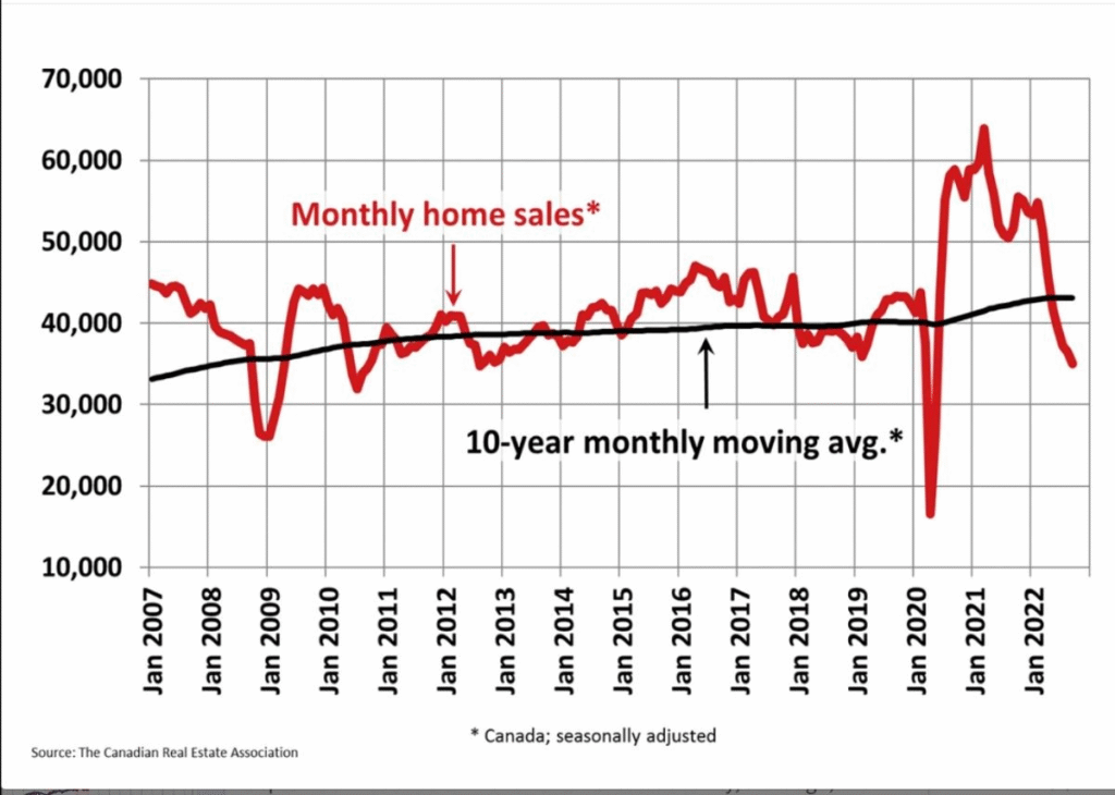 The actual (not seasonally adjusted) number of transactions in September 2022 came in 32.2% below that same month last year. It stood about 12% below the pre-pandemic 10-year average for that month (see chart below).