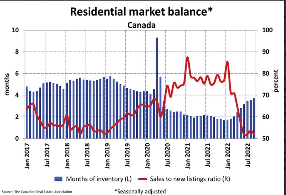 With sales down and new listings seeing a minor change in September, the sales-to-new listings ratio eased to 52% compared to 53.6% in August. The September 2022 reading for the national sales-to-new listings ratio was back on par with those in June and July and slightly below its long-term average of 55.1%.