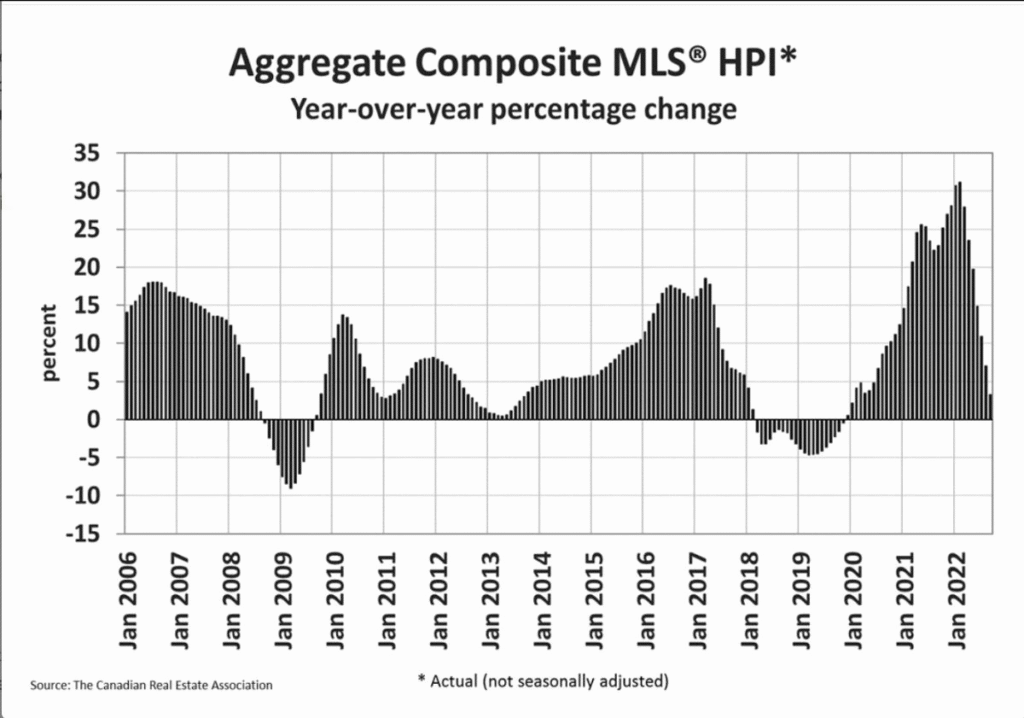 The non-seasonally adjusted Aggregate Composite MLS® HPI was still up by 3.3% on a year-over-year basis in September, a far cry from the near-30% record year-over-year gains logged in early 2022.
