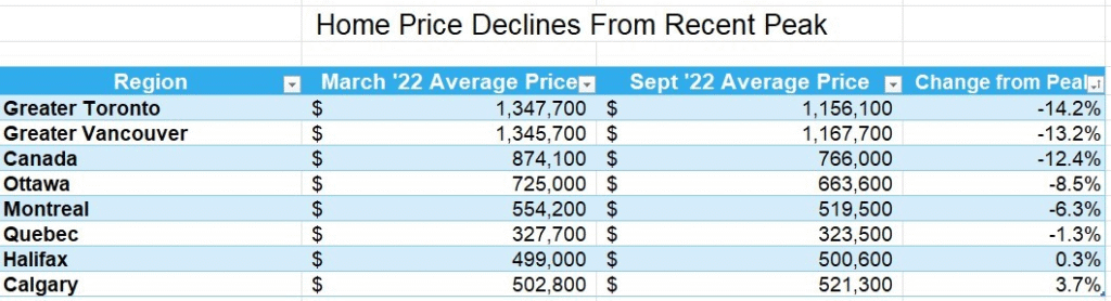 The table below shows the decline in average home prices in Canada and selected cities since prices peaked in March when the Bank of Canada began hiking interest rates. More details follow in the second table below. The largest price dips are in the GTA and the GVA, where the price gains were spectacular during the Covid-shutdown.