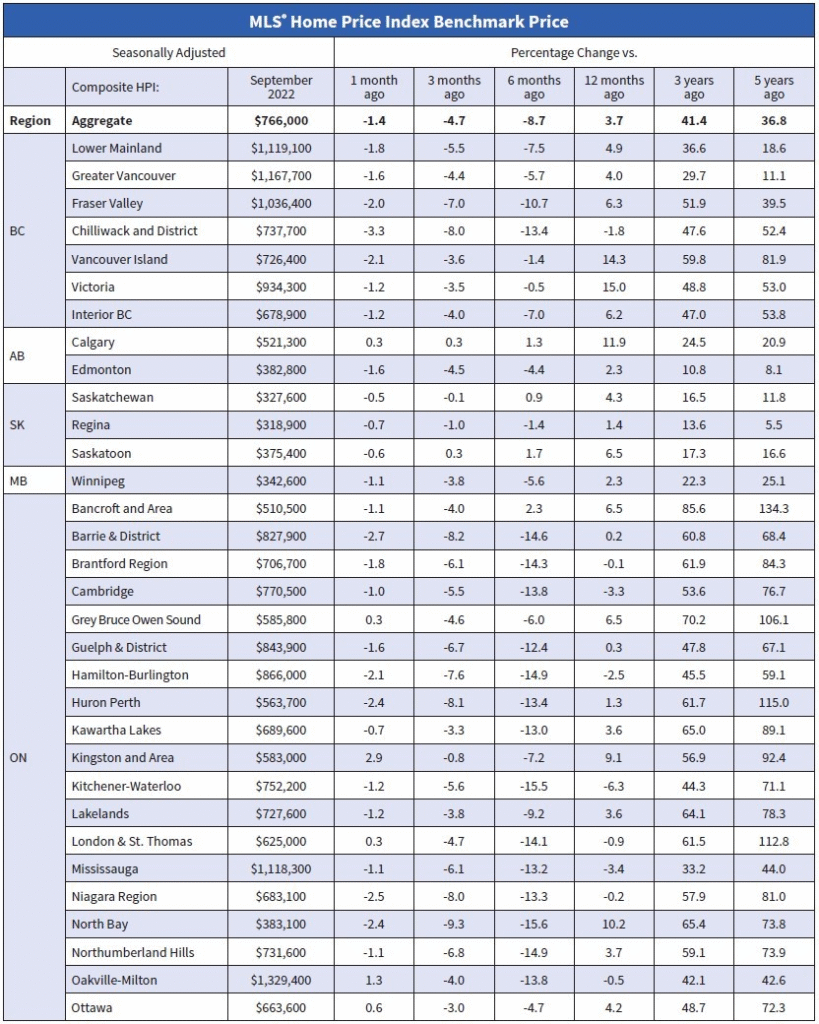 The Aggregate Composite MLS® HPI edged down 1.4% on a month-over-month basis in September 2022, not a small decline historically, but smaller than in June, July and August.