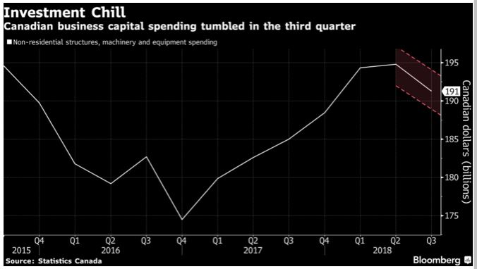 The Canadian economy grew at a 2% annual rate in the third quarter, mainly in line with the Bank’s expectation, however, September data suggest significantly less momentum going into Q4. The biggest disappointment was the plunge in business investment, which likely reflected trade uncertainty (see chart below). Business investment outside of the oil sector is likely to improve with the signing of the new trade agreement USMCA, the new federal tax measures to improve capital depreciation write-offs, and ongoing capacity constraints.
