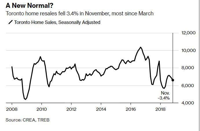 The Bank has raised borrowing costs five times since July 2017. New home building declined for the third consecutive quarter, down an annualized 5.9% in Q3. Moreover, according to the Toronto Real Estate Board (TREB), Toronto’s housing market posted its biggest monthly sales decline since March while prices remained little changed. Sales in Canada’s largest city fell 3.4% in November from the previous month TREB reported today (see chart below).