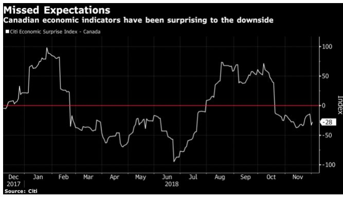 Economic data have been coming in below expectations according to Citibank’s Surprise Index, which tracks the difference between market expectations for economic indicators and their actual values. This index has trended downward since last summer and has been below zero since mid-October–around the time of the Bank of Canada’s last Monetary Policy Report (MPR) and the most recent rate hike.