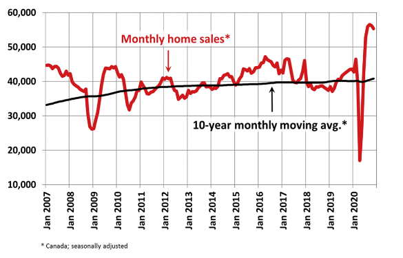 Home sales edged down moderately for extremely high levels in both October and November. Notwithstanding this, monthly activity is still running well above historical levels (see chart below).