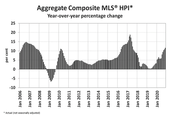 The non-seasonally adjusted Aggregate Composite MLS® HPI was up 11.6% on a y-o-y basis in November – the biggest gain since July 2017 (see chart below).
