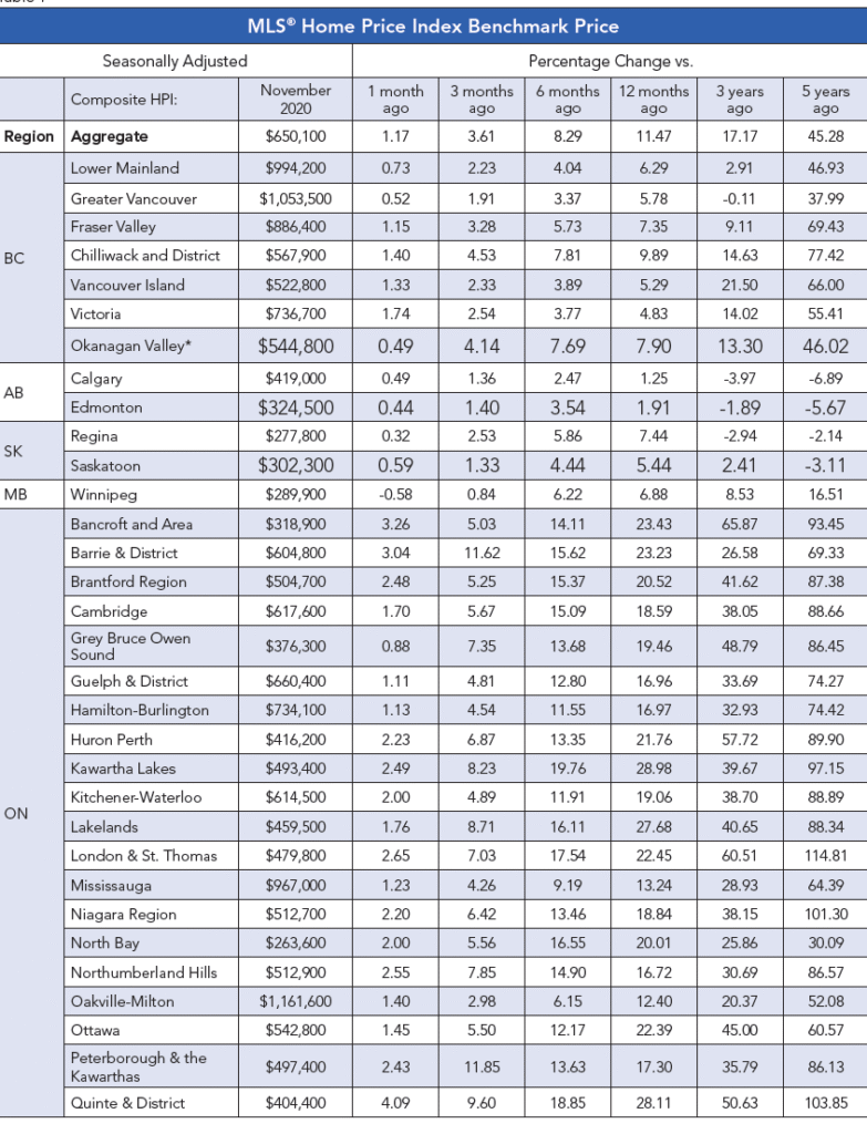The Aggregate Composite MLS® Home Price Index (MLS® HPI) rose by 1.2% m-o-m in November 2020. Of the 40 markets now tracked by the index, all but one were up between October and November.