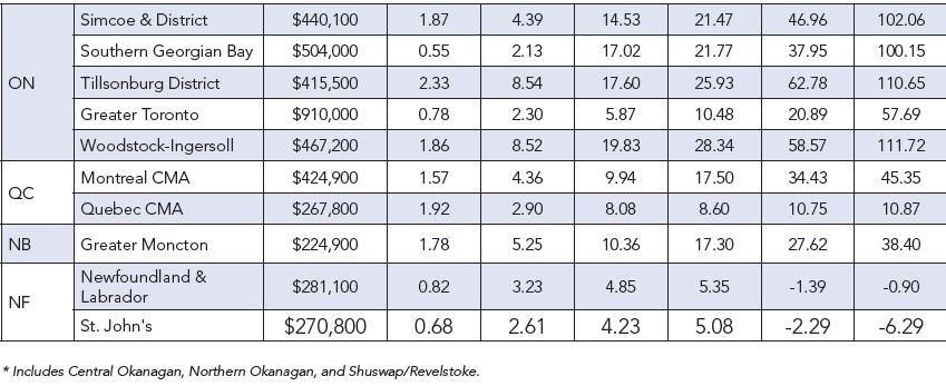 Y-o-y price gains in the range of 15-20% were posted in Hamilton, Niagara, Guelph, Cambridge, Grey-Bruce Owen Sound, Kitchener-Waterloo, Northumberland Hills, Peterborough and the Kawarthas, Montreal and Greater Moncton.