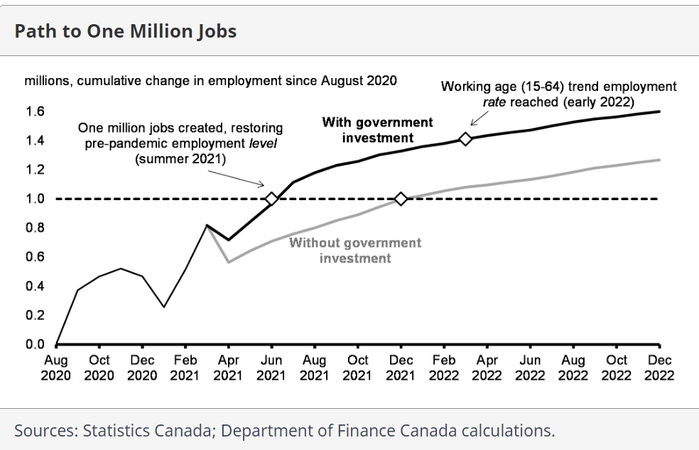 The government’s budget estimates its spending plan will create or maintain some 330,000 jobs next year and add about two percentage points to economic growth, part of a three-year boost from $101.4 billion in new spending over that time.