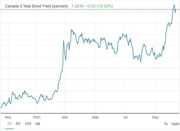 Some of the inflation is coming from disruptions on the supply side emanating from COVID-related disruptions, which may work themselves out in time. However, they’re still getting worse, and many suggest the timeline could be much longer than just this year. In addition, extreme weather events and climate change initiatives–both of which are more or less permanent–have also boosted inflation pressure. Consumer demand for goods and housing and business capital expenditures have surged in the face of labour shortages. Wage rates are beginning to rise. All of this has raised prices spilling into next year. Higher interest rates are likely sustainable even though the Bank of Canada and the Federal Reserve will likely hold overnight rates steady for the next year (see charts below).