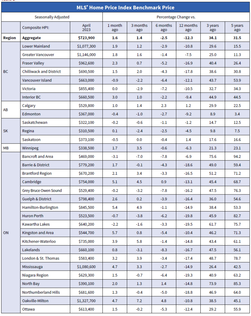 The Aggregate Composite MLS® Home Price Index (HPI) climbed 1.6% month-over-month in April 2023 – a significant increase for a single month. It was also broad-based. A monthly price rise from March to April was observed in most local markets.