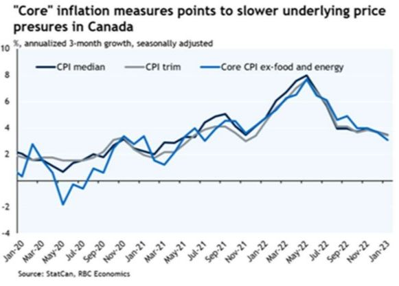 The Bank of Canada must feel pretty good about today’s inflation numbers. They confirm the wisdom of their announced pause in rate hikes at the January meeting. Despite continued strength in the labour market and January retail sales, headline and core inflation measures have declined again, with a five handle now on the headline rate. That is still a long way to the 3.0% inflation forecast by the end of this year, but it is moving in the right direction.